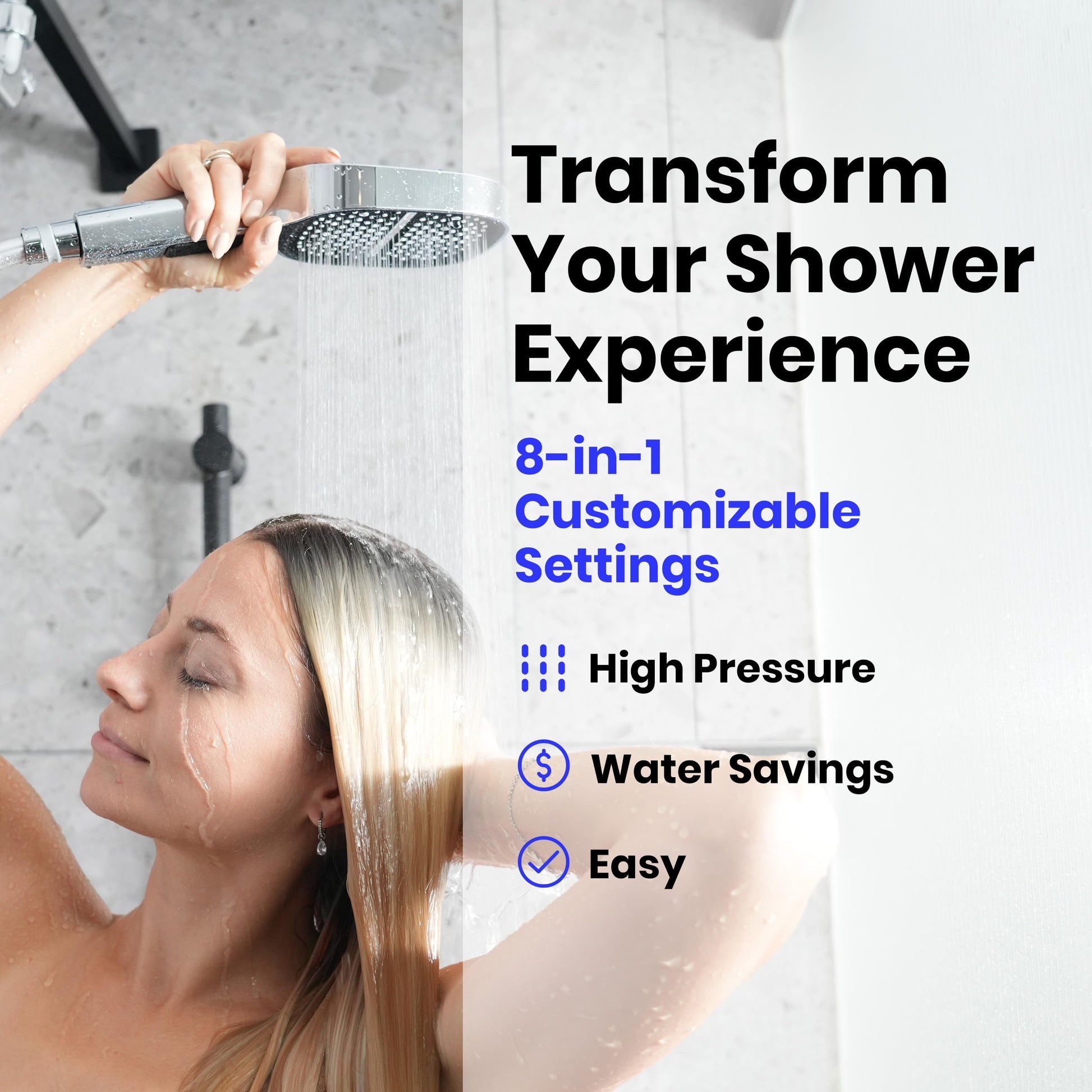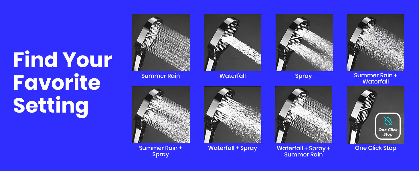 From soft mist to intense jet, this shower head offers seven selectable spray settings—Rain, Massage, Mist, Power Rain, Rain + Massage, Power Mist, and Pause. You can shift depending on your mood or need (relaxing rinse, muscle relief, or quick clean).